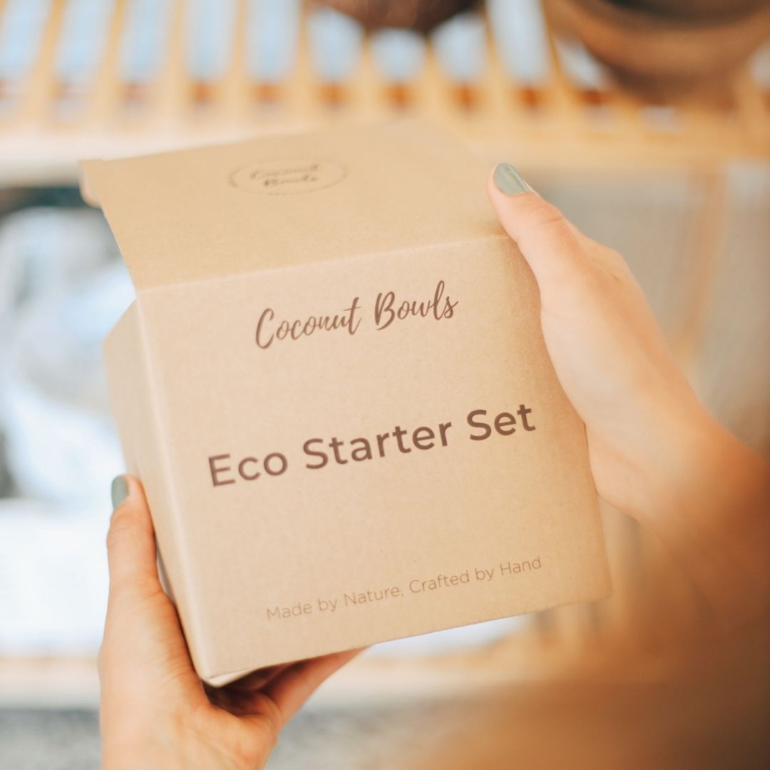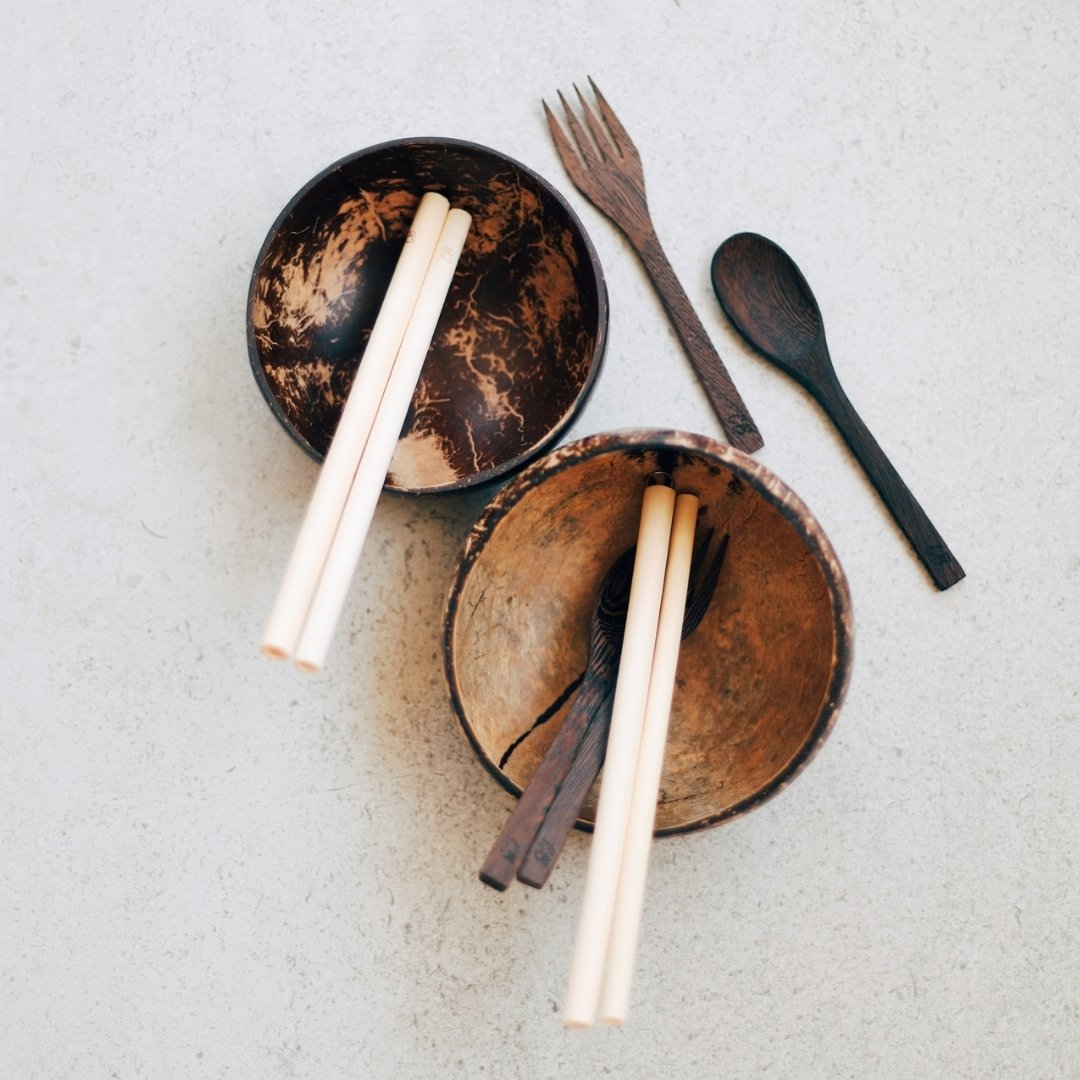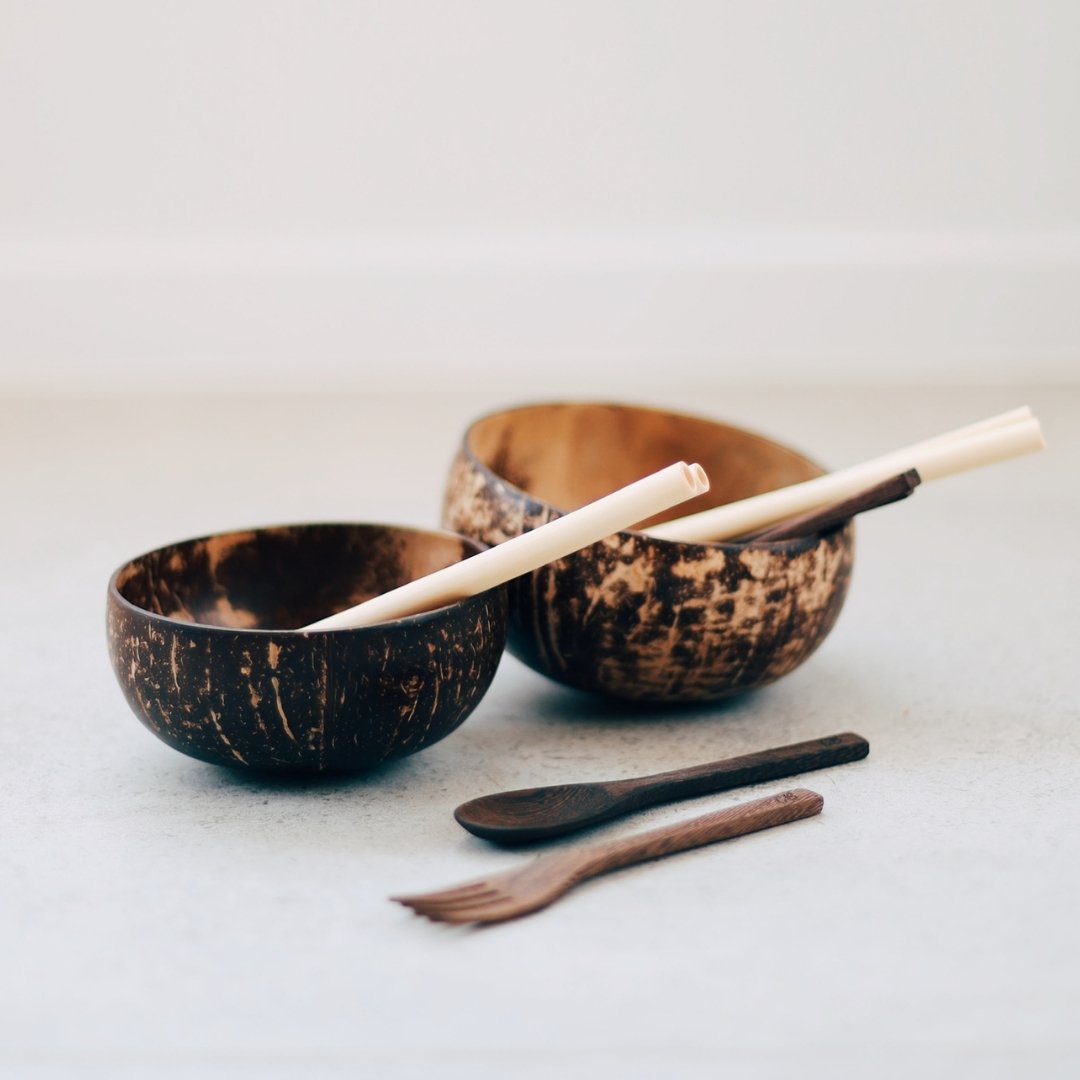Our Eco Starter Set includes our versatile Jumbo Coconut Bowl and Original Coconut Bowl, perfect for enjoying your favorite meals. Accompanying the bowls are two Wooden Spoons and two Wooden Forks, offering a natural and sustainable alternative to plastic cutlery. To complete the set, we've also included four Bamboo Straws, allowing you to sip your beverages sustainably.